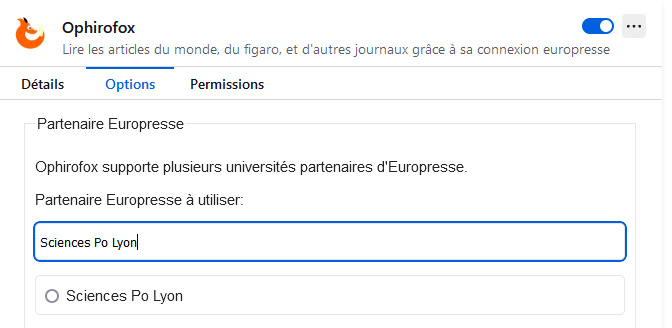 Lors de l’installation de l’extension, pensez bien à la paramétrer en sélectionnant “Sciences Po Lyon” dans la liste des partenaires Europresse :